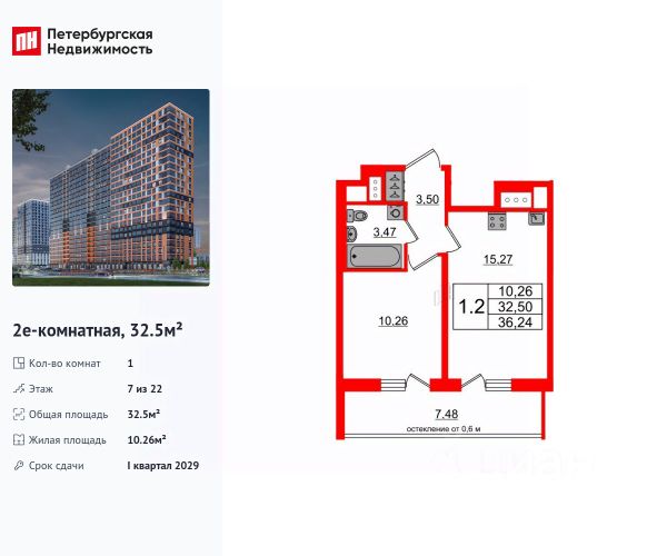 Продается квартира площадью 35.47 м² на 3 этаже 1 секции в Речной квартал от компании ГК "ТРЕСТ". Площадь кухни 13.87 м². Семейный жилой комплекс комфорт-класса "Речной квартал" от Группы компаний "ТРЕСТ" расположен в Невском районе Петербурга на пересечении Октябрьской набережной и Русановской улицы. Первая очередь квартала состоит из трёх корпусов, расположенных лучеобразно, чтобы максимально использовать естественное освещение и обеспечить видовые точки на локацию. Проект выделяется современными архитектурными решениями и дизайном. Концепция развития и благоустройства придомовой территории разделена на зоны отдыха, досуга и игровые площадки с учетом возраста и потребностей детей и взрослых. Квартал рассчитан на семейных покупателей, поэтому здесь нет студий: только одно-, двух- и трёхкомнатные квартиры. В проекте представлены квартиры с кухнями-гостиными, мастер-спальнями, гардеробными и кладовыми. "Речной квартал" - современный жилой комплекс с разнообразным благоустройством придомовой территории, просторными европланировками, закрытой охраняемой территорией и подземными паркингами. На территории комплекса уже функционирует детский сад на 110 мест. Также в квартале будет построена общеобразовательная школа на 475 мест с бассейном и стадионом. Открытие школы запланировано на 2029 год. Квартиры в ЖК "Речной квартал" можно приобрести с готовой отделкой от застройщика. Для покупателей квартир предусмотрено два варианта чистовой отделки "Ваниль" и "Шоколад". Чистовая отделка в квартирах ЖК "Речной квартал" предполагает монтаж натяжных потолков, укладку ламината, оклейку стен обоями под покраску, установку светильников и межкомнатных дверей. При отделке новой квартиры применяются качественные, натуральные и экологичные материалы, монтируется стильная импортная сантехника европейских брендов. В объявлении указана стоимость квартиры при 100% оплате. При других формах оплаты - базовую стоимость квартиры уточняейте на официальном сайте компании или у менеджера отдела продаж. Застройщик АО "Специализированный застройщик "Строительный трест".