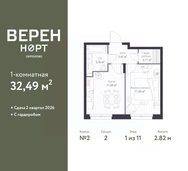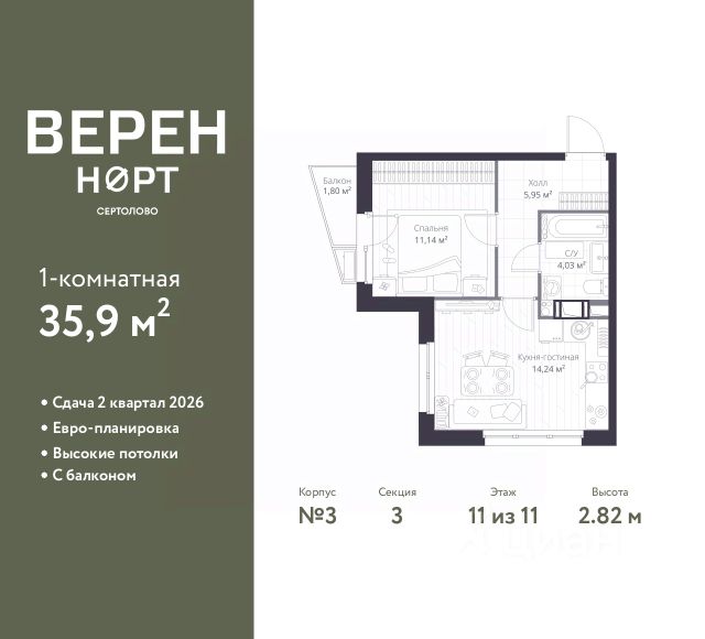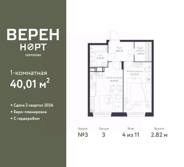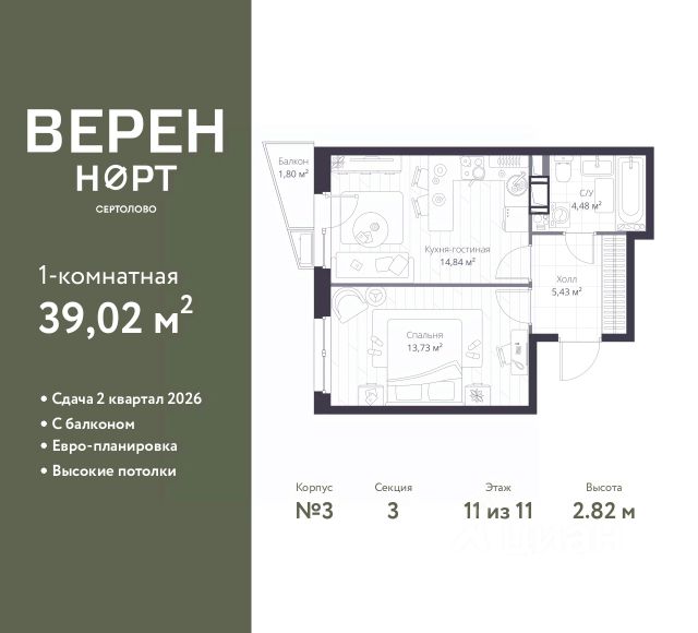 Продается однокомнатная квартира (чистовую отделку можно заказать у застройщика). Общая площадь 42.9 м2, жилая - 13.9 м2, потолки - 2.73 м. Это современное и эргономичное жилье для одного человека или семейной пары без детей. Комната имеет комфортную, почти квадратную форму, большое окно оснащено двухкамерными стеклопакетами. Просторная кухня (15.8м2) имеет выход на застекленную лоджию (3.7 м2), окна которой выходят во двор. В совмещенном санузле площадью хватит места для сантехники и стиральной машины. Из прихожей можно попасть в 3-х метровую гардеробную.