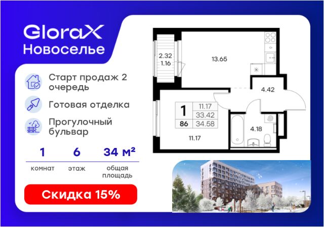 Продается 1-комн. квартира на 8-м этаже в строящемся проекте комфорт-класса GloraX Новоселье. Общая площадь лота составляет 31,62 кв. м, из которых 10,45 кв. м отведено под жилую и 11,87 кв. м под кухонную зону. Номер квартиры - 108 Преимущества квартиры: - Квартиры комфорт-класса с чистовой отделкой в двух цветовых гаммах на выбор - Зеленый район, 5 мин. до Гореловсого лесопарки, 10 мин. до Шунгеровского заказника - 7 мин. до КАД, 16 мин. до ЗСД - 864 м/м на открытой стоянке - Благоустроенный собственный прогулочный бульвар - Закрытые дворы с видеонаблюдением - Детские площадки с геопласткой и бизиборадми - Сад и школа в шаговой доступности - Спортивные площадки и вело-дорожки - Коммерческие помещения на 1 этажах GloraX Новоселье — новый проект комфорт-класса на юго-западной границе Санкт-Петербурга и Ленинградской области. Близость к зеленым зонам Гореловского лесопарка и природного Шунгеровского заказника, а также пешеходный многофункциональный бульвар в центре квартала — идеальное место для тех, кто ценит природу и тишину, при этом не готов отказываться от благ современной инфраструктуры. Застройка осуществляется в рамках единой концепции, предусматривающей не только создание комфортного жилья, но и формирование собственной внутренней благоустроенной среды. Территория каждого двора разделена на зоны отдыха, досуга и игровые площадки с учетом возраста и потребностей детей и взрослых создает неповторимую атмосферу, заряжающую энергией на новые свершения. Это проект, в котором спокойно во всех отношениях. Живите на природе, но с комфортом мегаполиса. Проведите теплые дни в Гореловском лесопарке. Познакомьте детей с историей в Стрельне, Петергофе или Красном селе. Они разположены в 30 минутах от проекта. До ж/д станции "Сергиево" 11 минут на автомобиле, до метро Проспект Ветеранов 20 минут, КАД 7 минут, ЗСД 16 минут. В шаговой доступности остановка общественного транспорта. Рядом с проектом будут построены школа и детский сад. Здесь все создано для максимального комфорта каждого жителя. Приватное пространство внутреннего двора с беседками для работы и отдыха, зеленый двор с уютным многоуровневым освещением, детскими эко-площадками и спортивными workout создает неповторимую атмосферу, заряжающую энергией на новые свершения. Цена указана при 100% оплате или стандартной ипотеке. Узнайте подробности в Отделе продаж. Продается 1-комнатная квартира в новостройке в городском поселении Аннинское Ломоносовского района.