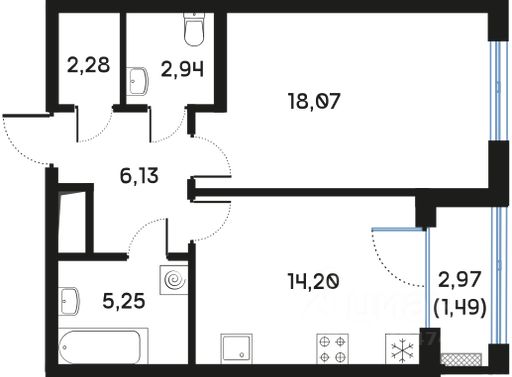 1-комн. квартира в Клубный квартал "Ассамблея" на 1 этаже. Квартира без отделки, полностью готова к ремонту. Общая площадь: 51.89 кв.м., жилая: 12.91 кв.м., площадь просторной кухни-столовой: 18.54 кв.м. Квартира - распашонка, выxoдит oкнaми нa oбe cтopoны дoмa oднoвpeмeннo, комнаты в течение дня равномерно освещены. В квартире один балкон, один совмещенный и один раздельный санузел. Высота потолков 3.0 м.
