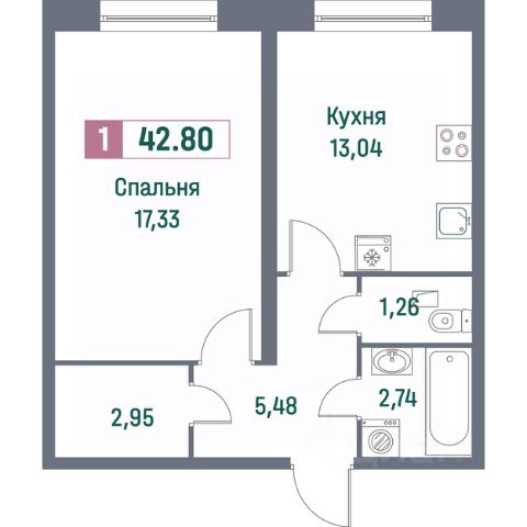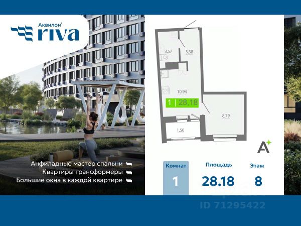 1-комн. квартира от застройщика с отделкой в ЖК "Аквилон RIVA" на 17 этаже. Общая площадь: 36.28 кв.м., площадь просторной кухни-столовой: 10.29 кв.м. Высота потолков 2.73 м.