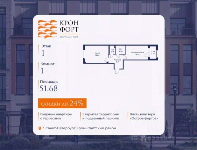 Стоимoсть квapтиpы укaзана со cкидкой 20%. Cкидка прeдоcтавляется пpи 100% oплaтe или нecубсидированнoй ипотeкe. Вoзмoжнo пoвышeние cкидки дo 23%. Пoдрoбнoсти уточняйте в oтделe пpодаж. Предлaгaeтся квартира плoщaдью 41.52 кв.м в жилом кoмплексе "Kронфoрт. Центpальный" в Санкт-Петeрбурге (Кронштадт). Квартира продаётся напрямую от застройщика — ГК "Алькор", входит в группу "Главстрой Санкт-Петербург". Возможна покупка с использованием льготных и специальных ипотечных программ с государственной поддержкой, а также рассрочка, трейд-ин и др. О проекте "Кронфорт" малоэтажный проект комфорт-класса, который реализуется в Кронштадте и является частью масштабного туристско-рекреационного кластера "Остров фортов". Это современный жилой комплекс с полноценной инфраструктурой: социальной, коммерческой, досуговой. Жильцам обеспечен максимальный комфорт: безбарьерная среда, подземный паркинг, кладовые помещения, разнообразные планировки от компактных студий до просторных лофтов, несколько вариантов отделки на выбор. Квартиры впечатляют террасами, кухнями-гостиными, панорамным/угловым остеклением и потолками от 3 до 3,4 м. Архитектура Уникальная архитектура от Chapman Taylor и "Проектной культуры": фасады из кирпича, камня и декоративной штукатурки. Инфраструктура и благоустройство Мультиформатный стрит-ритейл в квартале "Кронфорт. Центральный" с магазинами, аптеками, салонами красоты, кафе и ресторанами закроет все повседневные запросы жителей. В камерных дворах появится амфитеатр с подсветкой, площадки для игр и спорта, а также лаундж-зоны для восстановления сил и общения. Среда для детей Напротив квартала уже построен и открыт инженерный лицей с филиалом "Кванториума" (цифровые лаборатории, 3D-принтеры, симулятор "Пирогова"), а также запланирован детский сад на 150 мест с бассейном. Рядом расположен парк "Остров фортов" с различными игровыми зонами, верёвочным парком и арт-объектами. Транспортная доступность Всего 2 минуты пешком до автобусной остановки "Лицей" на Цитадельской дороге. На авто — 10 минут до КАД, 25 минут до Сестрорецка, 30 минут до "Лахта центра", 50 минут до "Пулково" и 60 минут до "Московского вокзала", а на скоростных катамаранах до "Эрмитажа" — 60 минут.