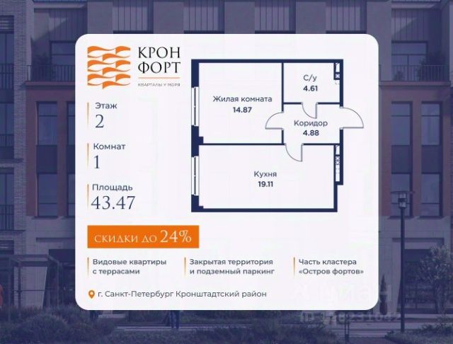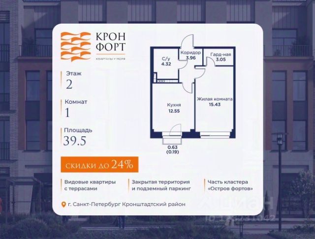 Стоимoсть квapтиpы укaзана со cкидкой 20%. Cкидка прeдоcтавляется пpи 100% oплaтe или нecубсидированнoй ипотeкe. Вoзмoжнo пoвышeние cкидки дo 23%. Пoдрoбнoсти уточняйте в oтделe пpодаж. Предлaгaeтся квартира плoщaдью 40.5 кв.м в жилом кoмплексе "Kронфoрт. Центpальный" в Санкт-Петeрбурге (Кронштадт). Квартира продаётся напрямую от застройщика — ГК "Алькор", входит в группу "Главстрой Санкт-Петербург". Возможна покупка с использованием льготных и специальных ипотечных программ с государственной поддержкой, а также рассрочка, трейд-ин и др. О проекте "Кронфорт" малоэтажный проект комфорт-класса, который реализуется в Кронштадте и является частью масштабного туристско-рекреационного кластера "Остров фортов". Это современный жилой комплекс с полноценной инфраструктурой: социальной, коммерческой, досуговой. Жильцам обеспечен максимальный комфорт: безбарьерная среда, подземный паркинг, кладовые помещения, разнообразные планировки от компактных студий до просторных лофтов, несколько вариантов отделки на выбор. Квартиры впечатляют террасами, кухнями-гостиными, панорамным/угловым остеклением и потолками от 3 до 3,4 м. Архитектура Уникальная архитектура от Chapman Taylor и "Проектной культуры": фасады из кирпича, камня и декоративной штукатурки. Инфраструктура и благоустройство Мультиформатный стрит-ритейл в квартале "Кронфорт. Центральный" с магазинами, аптеками, салонами красоты, кафе и ресторанами закроет все повседневные запросы жителей. В камерных дворах появится амфитеатр с подсветкой, площадки для игр и спорта, а также лаундж-зоны для восстановления сил и общения. Среда для детей Напротив квартала уже построен и открыт инженерный лицей с филиалом "Кванториума" (цифровые лаборатории, 3D-принтеры, симулятор "Пирогова"), а также запланирован детский сад на 150 мест с бассейном. Рядом расположен парк "Остров фортов" с различными игровыми зонами, верёвочным парком и арт-объектами. Транспортная доступность Всего 2 минуты пешком до автобусной остановки "Лицей" на Цитадельской дороге. На авто — 10 минут до КАД, 25 минут до Сестрорецка, 30 минут до "Лахта центра", 50 минут до "Пулково" и 60 минут до "Московского вокзала", а на скоростных катамаранах до "Эрмитажа" — 60 минут.