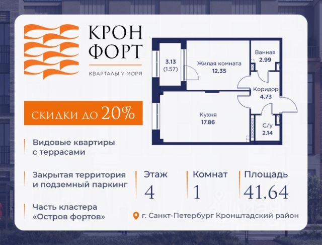 Стоимость квартиры указана со скидкой 20%. Скидка предоставляется при 100% оплате или несубсидированной ипотеке. Предлагается квартира площадью 40.69 кв.м в жилом комплексе "Кронфорт. Центральный" в Санкт-Петербурге (Кронштадт). Возможна покупка с использованием льготных и специальных ипотечных программ с государственной поддержкой. Высота потолков в квартирах — от 3 до 3,4 метров, окна увеличенного размера, есть варианты с эркерами, французскими балконами, лоджиями и террасами. Жилой квартал состоит из пяти четырехэтажных корпусов с закрытыми охраняемыми дворами, свободными от машин. Первые этажи формируют торговые променады в стиле пешеходных улиц исторической части Петербурга и Кронштадта. Внутренние пространства между корпусами — пешеходные зоны с уютными площадями. Архитектурный облик квартала разработан бюро "Проектная культура" и международной компанией Chapman Taylor. Инфраструктура комплекса включает: - Лицей с двумя бассейнами - Детский сад на 150 мест с бассейном и закрытой территорией - Веревочный парк - Игровые площадки для активного отдыха; - Кабинет врача общей практики. - Подземные паркинги с лифтами. - Мусоросборные камеры, индивидуальные кладовые. - Закрытые дворы с контролем доступа и видеонаблюдением. - Мультформатный стрит-ретейл с кафе и ресторанами. - Триатлон-центр и беговые/велодорожки. - Учебно-тренировочный комплекс для детей "Лагерь настоящих героев". Транспортная доступность обеспечивает удобный выезд на КАД (около 1-3 км), 2 минуты пешком до автобусной остановки "Лицей", 25 минут до Сестрорецка, 30 минут до "Лахта-центра", 50 минут до аэропорта "Пулково" и 60 минут до Московского вокзала. Для любителей моря доступен маршрут на "Метеоре" до центра Санкт-Петербурга. Отделка квартир предлагается как с готовой чистовой отделкой, так и со свободной планировкой без отделки для реализации индивидуальных дизайнерских решений. В третьем корпусе, продажи которого стартовали в марте 2025 года, доступны квартиры с просторными террасами, тремя балконами, кухнями-гостиными до 38 кв.м с окнами на две стороны, обеспечивающими панорамное освещение и виды. Если вам нужна помощь с оформлением ипотеки или дополнительная информация по комплексу и условиям покупки, обращайтесь в отдел продаж за консультацией. 1-комнатная квартира в новостройке в микрорайоне Кронштадт в Санкт-Петербурге.