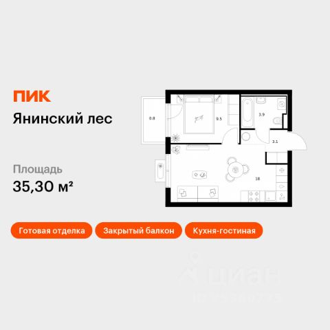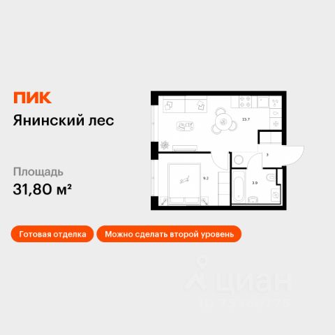 Жилая площадь 25.39 м2, кухня 5.44 м2, квартира без отделки.