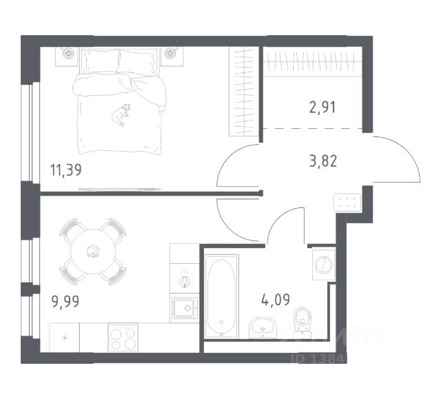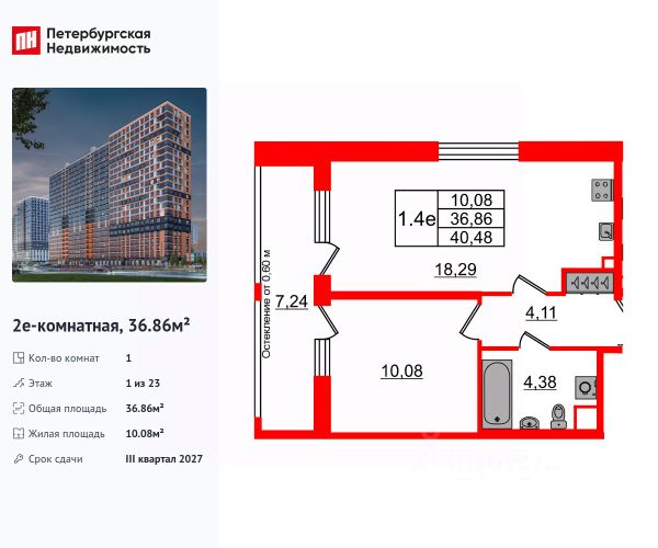 В продаже 1-комнатная квартира в корпусе 39 ЖК 'Живи! В Рыбацком'. Квартира располагается на 9 этаже, общая площадь 37.13 м2.