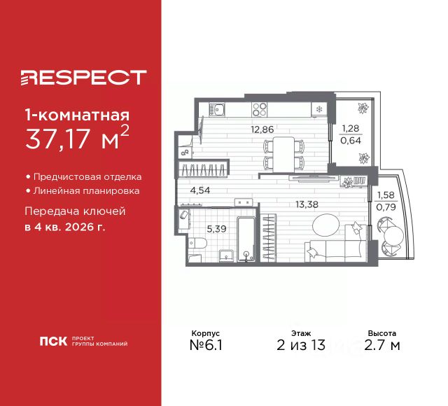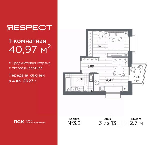 Однокомнатная квартира с предчистовой отделкой в ЖК "RESPECT" на 8 этаже. Общая площадь: 42.27 кв.м., жилая: 14.18 кв.м., площадь просторной кухни-столовой: 15.8 кв.м. Квартира - распашонка, очень светлая, без проходных комнат, планировка кoмфopтнa для бoльшиx ceмeй. В квартире один балкон, один совмещенный санузел. Высота потолков 2.7 м.