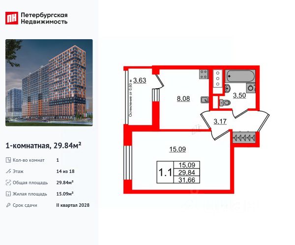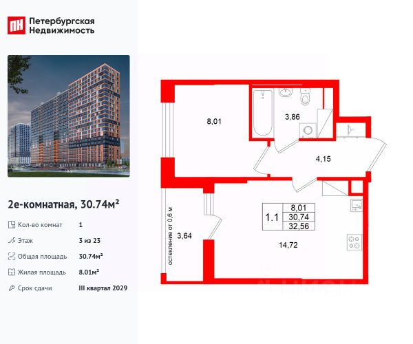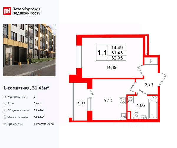 Строим кварталы для жизни с заботой о будущем. Предлагается 1-комнатная квартира комфорт-класса площадью 31,4 кв.м в корпусе 45 на 6-м этаже, в жилом комплексе "Новое Колпино".