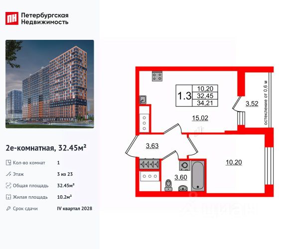 • 1-4 комнатные квартиры площадью от 30,2 м² до 45,6 м² м².