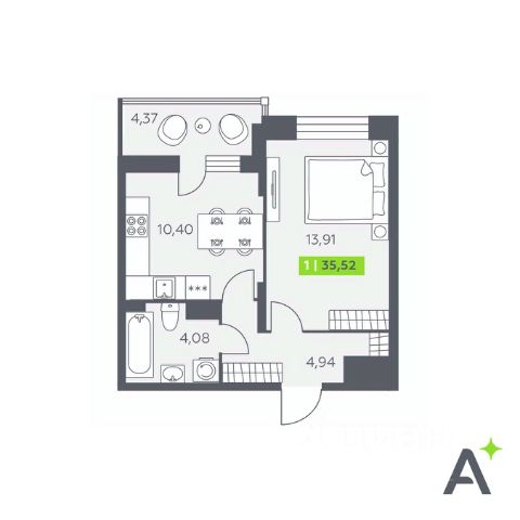 Общая площадь - 40 м2( 34.1м2 без лоджии)