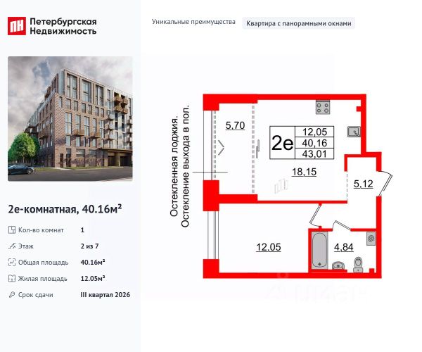 Продается просторная 1-комнатная квартира от застройщика в жилом комплексе "Imperial Club" в уютном Василеостровском районе. До метро можно добраться на транспорте всего за 7 минут. Окна от пола до потолка позволят безгранично любоваться видами Петербурга, наполнят комнату солнцем и светом! Уникальная, функциональная европланировка, большая кухня-гостиная 18.15 м², просторная прихожая 5.12 м². Общая площадь квартиры - 40.16 м², жилая 12.05 м², высота потолка 3 м. Квартира продается c черновой отделкой. Что особенного в ЖК "Imperial Club"? • Парадные виды на Большую Неву и Английскую набережную • Изысканная архитектура жилого комплекса. • Уникальное благоустройство. • Двухуровневые входные группы. • Панорамные окна, открытые террасы, вантовые балконы. • Двухэтажные сити-виллы с патио, квартиры с возможностью обустройства камина и зимнего сада с растениями. • Просторный фитнес-центр с бассейном и спа-зоной на первом этаже . • Премиальный сервис: заказ такси,выгул собак, уборка, доставка вещей . Продается 1-комнатная квартира в новостройке в округе № 7 в Санкт-Петербурге.