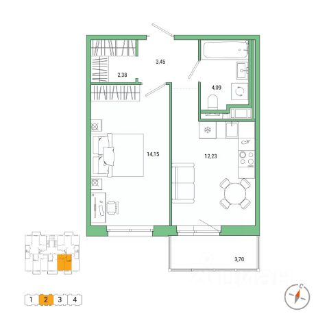 Общая площадь составляет 33.36 кв. м. застекленная лоджия 3.38 кв.м.