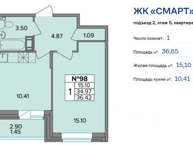 Продаётся 1-комнатная квартира в сданном доме (Ленсоветовский, 19к2 (Корпус 1)), срок сдачи: II-кв. 2025, общей площадью 36.92 кв.м., на 2 этаже. Жилой многоквартирный дом от застройщика "СЗ Смарт".