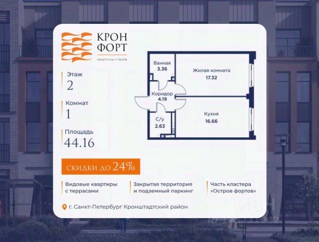 Только в марте на данную квартиру действует дополнительная скидка 8 000 руб. с кв.м. Стоимость квартиры в объявлении указана со скидкой 21%. Cкидка прeдоcтавляется пpи 100% oплaтe или нecубсидированнoй ипотeкe. Возможно повышение скидки до 24%. Подробности уточняйте в отделе продаж. Предлaгaeтся квартира плoщaдью 39.31 кв.м в жилом кoмплексе "Kронфoрт. Центpальный" в Санкт-Петeрбурге (Кронштадт). Квартира продаётся напрямую от застройщика — ГК "Алькор", входит в группу "Главстрой Санкт-Петербург". Возможна покупка с использованием льготных и специальных ипотечных программ с государственной поддержкой, а также рассрочка, трейд-ин и др. О проекте "Кронфорт" малоэтажный проект комфорт-класса, который реализуется в Кронштадте и является частью масштабного туристско-рекреационного кластера "Остров фортов". Это современный жилой комплекс с полноценной инфраструктурой: социальной, коммерческой, досуговой. Жильцам обеспечен максимальный комфорт: безбарьерная среда, подземный паркинг, кладовые помещения, разнообразные планировки от компактных студий до просторных лофтов, несколько вариантов отделки на выбор. Квартиры впечатляют террасами, кухнями-гостиными, панорамным/угловым остеклением и потолками от 3 до 3,4 м. Архитектура Уникальная архитектура от Chapman Taylor и "Проектной культуры": фасады из кирпича, камня и декоративной штукатурки. Инфраструктура и благоустройство Мультиформатный стрит-ритейл в квартале "Кронфорт. Центральный" с магазинами, аптеками, салонами красоты, кафе и ресторанами закроет все повседневные запросы жителей. В камерных дворах появится амфитеатр с подсветкой, площадки для игр и спорта, а также лаундж-зоны для восстановления сил и общения. Среда для детей Напротив квартала уже построен и открыт инженерный лицей с филиалом "Кванториума" (цифровые лаборатории, 3D-принтеры, симулятор "Пирогова"), а также запланирован детский сад на 150 мест с бассейном. Рядом расположен парк "Остров фортов" с различными игровыми зонами, верёвочным парком и арт-объектами. Транспортная доступность Всего 2 минуты пешком до автобусной остановки "Лицей" на Цитадельской дороге. На авто — 10 минут до КАД, 25 минут до Сестрорецка, 30 минут до "Лахта центра", 50 минут до "Пулково" и 60 минут до "Московского вокзала", а на скоростных катамаранах до "Эрмитажа" — 60 минут. Продам 1-комнатную квартиру от застройщика в Кронштадте.