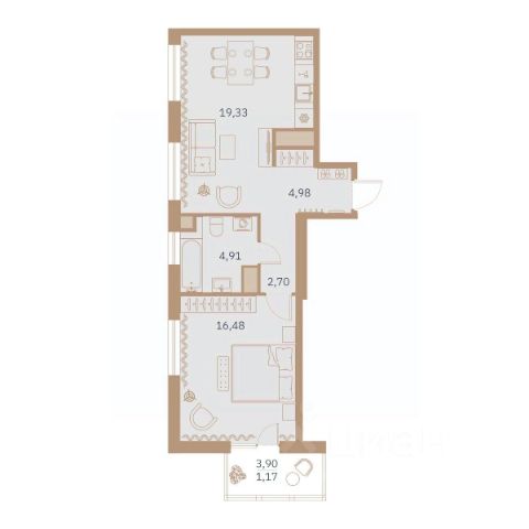 Совмещенный санузел (3,7м), что увеличивает полезное пространство.