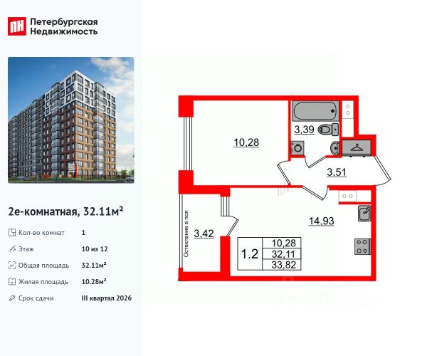 Продается 1-комнатная квартира в ЖК "Октябрьская набережная" на 14 этаже. Общая площадь составляет 33.00 кв. м. Квартира с чистовой отделкой . Жилой комплекс "Октябрьская набережная" располагается по адресу Санкт-Петербург, Невский. Октябрьская набережная - жилой комплекс на берегу Невы, который отличается живописными видами и удобным местоположением: в окрестностях ЖК есть всё необходимое для комфортной жизни. Расположение: • 2 минуты пешком до набережной Невы; • 7 минут до станции метро "Улица Дыбенко" на автомобиле; • 8 минут до Большого Обуховского моста на автомобиле; • 15 минут до ТРК "Лондон Молл" на автомобиле. Будущие жильцы могут обустроить квартиру по своему вкусу: предлагается 2 вида отделки - уютный темный "Comfort Wood" и легкий светлый "Comfort Stone". Отделка выполняется из качественных материалов: прочный ламинат с фактурой светлого дерева или белого камня, светлые обои под покраску, лаконичные межкомнатные двери. Вход в парадные расположен на уровне земли и создает доступную среду для пожилых людей, людей с ограниченными возможностями и мам с колясками. На цокольном этаже находятся кладовые, которые позволят освободить пространство квартиры от лишних вещей. Во всех парадных расположены колясочные, рядом с ними - велопарковки. На территории комплекса есть всё для любителей активного отдыха: спортивные площадки, уличные тренажеры, велодорожки, места для игры в баскетбол и волейбол. Спортсмены могут насладиться живописными видами во время пробежки вдоль набережной. В зелёных и облагороженных дворах есть всё и для семей с детьми: тематические площадки, детский сад и даже школа. Комфортная среда для питомцев - еще одно преимущество "Октябрьской набережной": рядом с домами находится площадка для выгула собак. Для удобства автомобилистов на территории комплекса устроены крытые паркинги с безопасными охраняемыми выездами и большим количеством машино-мест. В пешей доступности расположены супермаркеты, кафе, парикмахерские, отделения банков. Преимущества: • Первая береговая линия • Двор без машин • Доступная среда • Развитая инфраструктура • Школа и детский сад во дворе • Близость к метро Успейте приобрести квартиру на выгодных условиях! Чтобы узнать подробности, обращайтесь за консультацией по телефону.