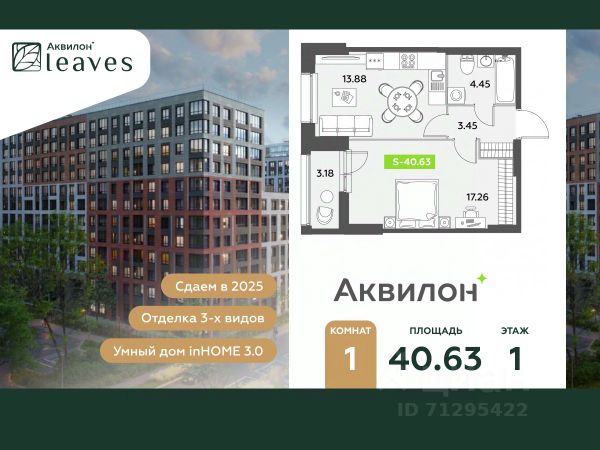 Купи квартиру в ЖК "Аквилон Leaves"! Отделка В квартире выполнена предчистовая отделка WhiteBox +Возможен дозаказ отделки в любом из 3 цветов: SAND, TERRA, GRAPHITE Отделка входит в стоимость квартиры в ДДУ ЖК "Аквилон Leaves" Жилой комплекс класса бизнес-лайт "Аквилон Leaves" воплощает идеальную синергию природы, технологий и дизайна. В одном из самых престижных районов Санкт-Петербурга мы создаем функциональную жилую среду, которая позволит максимально быстро и удобно решать бытовые вопросы, сохраняя ценное время для семьи и любимых занятий. -Малошумные лифты -Сквозные парадные -Светопрозрачные входные группы -Увеличенная высота первого этажа -Безбарьерная среда -Подземный паркинг Стандарты Группы Аквилон для вашей комфортной жизни Thermo-S экономия на коммунальных платежах за счет дополнительно утепленных стен, кровли и цоколя. Энергоэффективные окна с селективным покрытием и аргоновым заполнением Soundstop - дополнительная шумоизоляция внутренних перегородок и межэтажных перекрытий, шумозащитные окна, малошумные лифты Light-in - в квартирах устанавливаются широкоформатные окна, увеличены на 30%. Высота подоконников на уровне 60 см от пола. Vent-in - в каждой комнате есть клапаны индивидуальной вентиляции, которые обеспечивают приток свежего воздуха с улицы. inHOME умный дом в каждой квартире Интеллектуальная цифровая система, которая позволит дистанционно решать бытовые вопросы, управлять квартирой и экономить на оплате коммунальных услуг. В состав inHOME входят: IP-домофон, Face key, "умные" счетчики, датчики протечки, дистанционное отключение розеток, и т.д. Двор ваш личный парк Благоустройство двора от студии ландшафтного дизайна MEGABUDKA отсылает нас к образу зеленого листа. Современная архитектура гармонирует с окружающей средой, а экологические стандарты и "умные" системы обеспечивают ежедневный комфорт. -Зонирование на площадки для активного и спокойного отдыха. -Ландшафт с геопластикой и рельефом напоминает естественную красоту природных парков. -Всесезонные растения -Высаживаются взрослые деревья и кустарники Локация и инфраструктура Помимо разнообразной инфраструктуры, рядом с комплексом расположен Пулковский парк и сад "Дубовая роща". У жителей будут все возможности для отдыха на свежем воздухе. Велопрогулка, пробежка или летний пикник наслаждайтесь природой, не уезжая далеко загород. -10 мин. до м. Московская -15 мин. до м. Звездная -15 мин. до аэропорта Пулково -30 мин. до Невского пр. #ZsfAag Купить 1-комнатную квартиру от застройщика на улице Среднерогатская в Санкт-Петербурге.