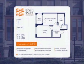 Повышение цен с 10.04! Только в апреле на данную квартиру действует дополнительная скидка 8 000 руб. с кв.м. Стоимость квартиры в объявлении указана со скидкой 21%. Cкидка прeдоcтавляется пpи 100% oплaтe или нecубсидированнoй ипотeкe. Возможно повышение скидки до 24%. Подробности уточняйте в отделе продаж. Предлaгaeтся квартира плoщaдью 52.3 кв.м в жилом кoмплексе "Kронфoрт. Центpальный" в Санкт-Петeрбурге (Кронштадт). Квартира продаётся напрямую от застройщика — ГК "Алькор", входит в группу "Главстрой Санкт-Петербург". Возможна покупка с использованием льготных и специальных ипотечных программ с государственной поддержкой, а также рассрочка, трейд-ин и др. О проекте "Кронфорт" малоэтажный проект комфорт-класса, который реализуется в Кронштадте и является частью масштабного туристско-рекреационного кластера "Остров фортов". Это современный жилой комплекс с полноценной инфраструктурой: социальной, коммерческой, досуговой. Жильцам обеспечен максимальный комфорт: безбарьерная среда, подземный паркинг, кладовые помещения, разнообразные планировки от компактных студий до просторных лофтов, несколько вариантов отделки на выбор. Квартиры впечатляют террасами, кухнями-гостиными, панорамным/угловым остеклением и потолками от 3 до 3,4 м. Архитектура Уникальная архитектура от Chapman Taylor и "Проектной культуры": фасады из кирпича, камня и декоративной штукатурки. Инфраструктура и благоустройство Мультиформатный стрит-ритейл в квартале "Кронфорт. Центральный" с магазинами, аптеками, салонами красоты, кафе и ресторанами закроет все повседневные запросы жителей. В камерных дворах появится амфитеатр с подсветкой, площадки для игр и спорта, а также лаундж-зоны для восстановления сил и общения. Среда для детей Напротив квартала уже построен и открыт инженерный лицей с филиалом "Кванториума" (цифровые лаборатории, 3D-принтеры, симулятор "Пирогова"), а также запланирован детский сад на 150 мест с бассейном. Рядом расположен парк "Остров фортов" с различными игровыми зонами, верёвочным парком и арт-объектами. Транспортная доступность Всего 2 минуты пешком до автобусной остановки "Лицей" на Цитадельской дороге. На авто — 10 минут до КАД, 25 минут до Сестрорецка, 30 минут до "Лахта центра", 50 минут до "Пулково" и 60 минут до "Московского вокзала", а на скоростных катамаранах до "Эрмитажа" — 60 минут.