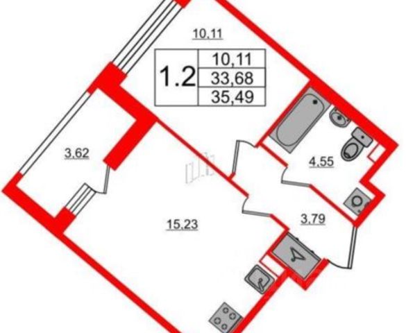 Общая площадь квартиры 32,58 м² + Лоджия 3,38 м².