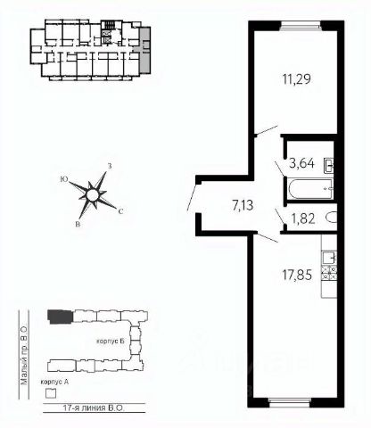 просторная кухня-гостиная 17,6 м² — сердце квартиры, где легко разместится обеденная зона, диван, медиа-зона;