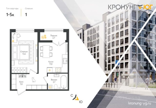 Большая кухня 15,69 м.кв., комната 10,36 м.кв., прихожая 4,30 м.кв. с нишей для шкафа, санузел совмещенный 3,86 м.кв.