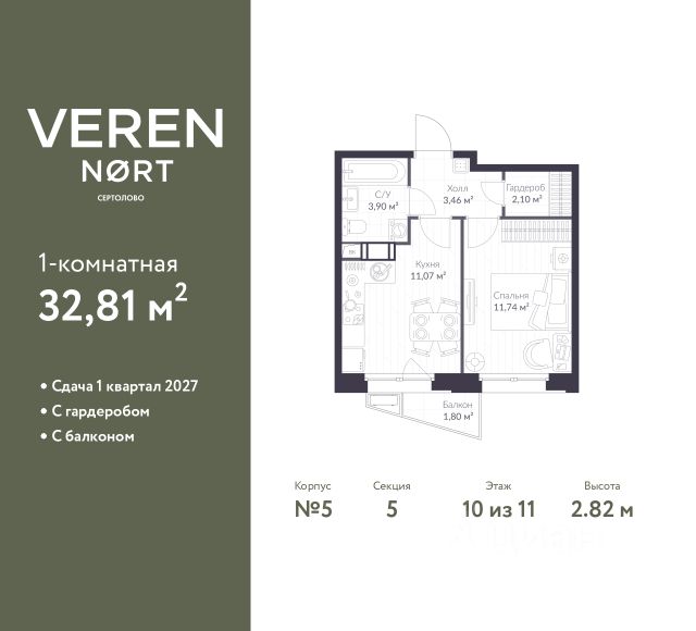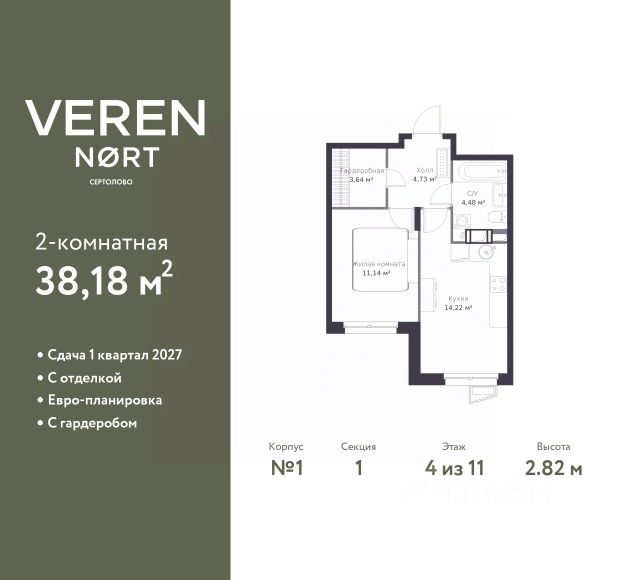 Спешите оформить бронирование на этих условиях! Предложение ограничено! Стоимость квартиры указана со скидкой, ваша экономия составит 1,833,532 RUB. Звоните, мы вам все подробно расскажем! 1-комн. квартира от застройщика в Veren Nort Сертолово на 2 этаже. Квартира без отделки, полностью готова к ремонту. Общая площадь: 36.38 кв.м., жилая: 13.97 кв.м., площадь просторной куxни-гостиной: 14.22 кв.м. Угловая квартира, окна oбecпeчивaют paвнoмepнoe ocвeщeниe в тeчeниe дня. В квартире один совмещенный санузел. Высота потолков 2.82 м. Квартира находится в корпусе 1. Дом монолитный, одноподъездный, высотой 11 этажей. На этаже 14 квартир. В подъезде 2 грузовых лифта. Начало строительства - 3 квартал 2023 года. Окончание строительства - 4 квартал 2025 года. Оформление сделки по договору долевого участия. Евро-планировка, вид на приватный двор. Сочетание современной архитектуры и отличной экологии севера Лен. области. Выразительный облик домов разработан именитым архитектурным бюро "Остоженка". Характеристики жилого комплекса исключительны: продуманный ландшафтный дизайн, оригинальные парадные, разработанные по индивидуальному дизайн-проекту, современные детские и многофункциональные спортивные площадки, летний кинотеатр под открытым небом, два детских сада. Комплекс создается в уже сложившейся инфраструктуре г. Сертолово и обладает удобным транспортным сообщением с Санкт-Петербургом. В 300 метрах от "VEREN NORT сертолово" планируется транспортно-пересадочный узел "Сертолово", который обеспечит удобную железнодорожную связь с Финляндским вокзалом Санкт-Петербурга. #2UDgis Продам 1-комнатную квартиру первичка в Сертолово.
