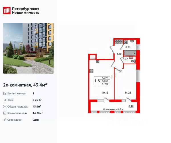 Квартира общей площадью 39,2 кв. м: эргономичная кухня-столовая - 10,44 кв. м, уютная видовая спальня - 18,44 с выходом на лоджию (5 кв. м), раздельный санузел. Высота потолков - 2,8 м.