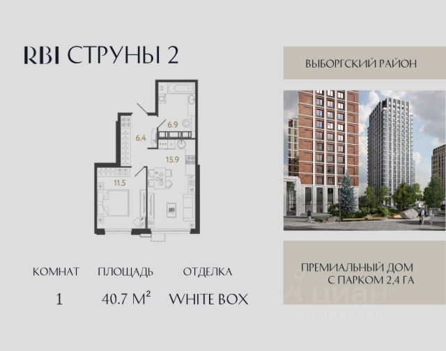 ЖК Loft у Озера/ Дома введены в эксплуатацию в 2024г. Приз Зрительских Симпатий и Дипломы "Honourable Mention" жюри международной архитектурной премии "GOLDEN TREZZINI - 2024" в номинации "Лучшее капитальное строение Санкт-Петербурга". Местоположение: Санкт-Петербург, Выборгский район, тер. Шувалово-Озерки Загород в Городе / В окружении парков и озёр / Инфраструктура есть Пешая доступность: / Автоб. ост. -9 мин / Магазин - 6 мин/ Дет. сад - 7 мин. Кубный ЖК / Мало квартир в доме / Приватная территория Стиль Лофт / Тёмный сканди / Кирпич ручной формовки Бизнес класс/ Современные решения / Добротные дома Панорамные окна / Черные алюминиевые стеклопакеты Балконы и Террасы / Площадь от 8м2 / В каждой квартире Патио / Кладовые / Подземный паркинг Мульти - Двор / Во дворе как на даче / Место для спорта, отдыха, работы и общения Отделка черновая/ Тёплый пол в стяжке / Внутрипольные конвекторы Усиленная звукоизоляция межэтажных перекрытий / Стены 46 см. Качественные двери в квартиру / Вентиляционные КИВы Квартира: 1 ккв / 2эт / H 2.85 м Площадь 43,5 м2 / Кухня 11,5м2 / 2 Санузла / Кладовка 1,5 м2 Балкон 8,1 м2 / Холодное безрамное остекление / Окна на юг Продажа от застройщика. Льготная семейная ипотека возможна. 1-комнатная квартира первичка в районе Выборгский в Санкт-Петербурге.
