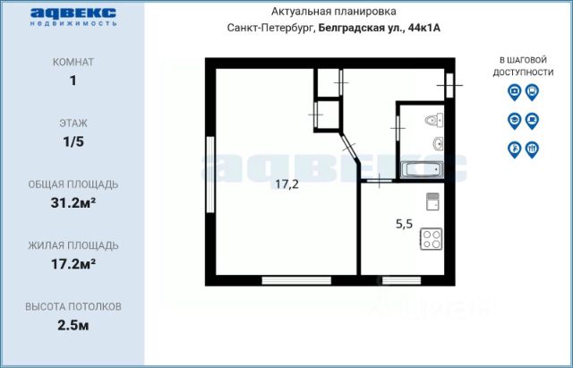 • ✓ В базе Циан 3 1-комнатных квартир в пятиэтажных домах на улице Белградская в Санкт-Петербурге