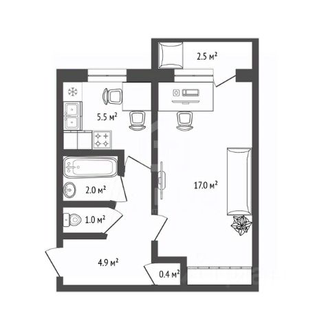 Общая площадь  30,1 кв.м. Жилая площадь -15,7 кв. м. Кухня - 6,8 кв.м. С/У - совмещенный. Высота потолка - 2,55 м.
