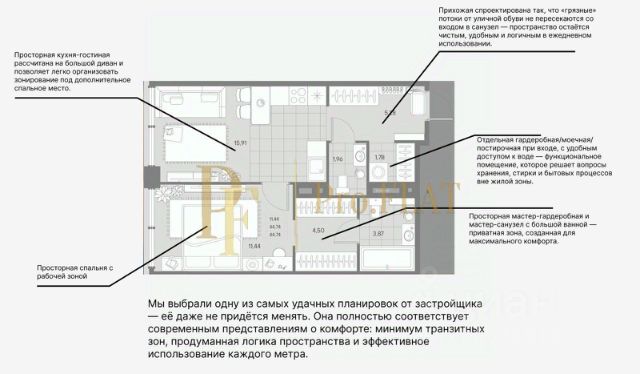- Просторная мастер-гардеробная и приватный мастер-санузел с местом под большую ванну.
