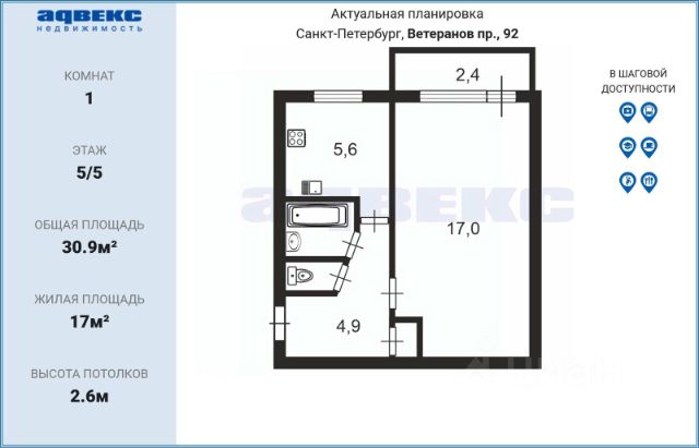 ID: 1914592 Вашему вниманию продается уютная, светлая однокомнатная квартира в зеленом районе города. Общая площадь составляет 30.9, площадь комнаты 17м, кухня-5.6м. Есть балкон. Санузел раздельный, все трубы заменены и установлены новые счетчики воды. Квартира требует ремонта. Окна выходят во двор. Дом в хорошем состоянии. В парадных заменены окна на стеклопакеты. Рядом с домом находятся остановки общественного транспорта, что обеспечивает отличную транспортную доступность. Один взрослый собственник, без обременений, никто не зарегистрирован. Можно привлечь для покупки нашей квартиры ипотеку, субсидии, маткапитал. Звоните, пишите - буду рада ответить на Ваши вопросы и организовать просмотры в удобное для Вас время