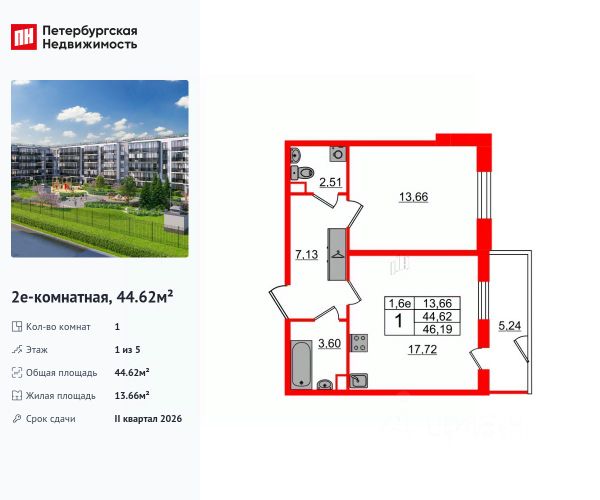 Продается просторная 1-комнатная квартира от застройщика в жилом комплексе "Парадный ансамбль" в престижном Московском районе. До метро можно добраться на транспорте всего за 20 минут. Удобная, классическая, функциональная европланировка, большая кухня-гостиная 17.72 м², просторная прихожая 7.13 м². Общая площадь квартиры - 44.62 м², жилая 13.66 м², высота потолка 2.77 м. Квартира продается с отделкой "NORD LINE WHITE". Что особенного в ЖК "Парадный ансамбль"? • Инновационный Лицей Setl с оригинальной архитектурной концепцией и уникальной образовательной средой • Масштабное малоэтажное строительство в престижном Московском районе • Рекреационные зоны: парадный парк в центре квартала, ручей с собственной набережной, центральная площадь, ресторанный комплекс и пешеходный бульвар • Фасады из керамогранита и кирпича с яркими и акцентными входными группами • Две самые большие площадки Setl Kids и Setl Sport • Уникальные квартиры.High Flat на последних этажах, палисадники у квартир на первом этаже, семейные секции, квартиры с саунами и окном в ванной