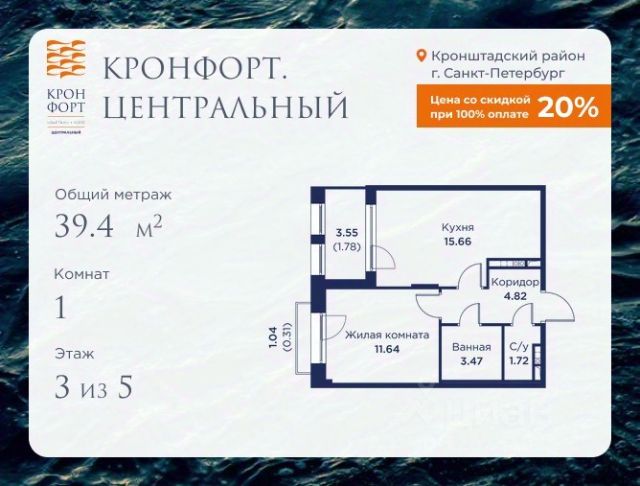 Стоимость квартиры указана со скидкой 20%. Скидка предоставляется при 100% оплате или несубсидированной ипотеке. Предлагается квартира площадью 40.69 кв.м в жилом комплексе "Кронфорт. Центральный" в Санкт-Петербурге (Кронштадт). Возможна покупка с использованием льготных и специальных ипотечных программ с государственной поддержкой. Высота потолков в квартирах — от 3 до 3,4 метров, окна увеличенного размера, есть варианты с эркерами, французскими балконами, лоджиями и террасами. Жилой квартал состоит из пяти четырехэтажных корпусов с закрытыми охраняемыми дворами, свободными от машин. Первые этажи формируют торговые променады в стиле пешеходных улиц исторической части Петербурга и Кронштадта. Внутренние пространства между корпусами — пешеходные зоны с уютными площадями. Архитектурный облик квартала разработан бюро "Проектная культура" и международной компанией Chapman Taylor. Инфраструктура комплекса включает: - Лицей с двумя бассейнами - Детский сад на 150 мест с бассейном и закрытой территорией - Веревочный парк - Игровые площадки для активного отдыха; - Кабинет врача общей практики. - Подземные паркинги с лифтами. - Мусоросборные камеры, индивидуальные кладовые. - Закрытые дворы с контролем доступа и видеонаблюдением. - Мультформатный стрит-ретейл с кафе и ресторанами. - Триатлон-центр и беговые/велодорожки. - Учебно-тренировочный комплекс для детей "Лагерь настоящих героев". Транспортная доступность обеспечивает удобный выезд на КАД (около 1-3 км), 2 минуты пешком до автобусной остановки "Лицей", 25 минут до Сестрорецка, 30 минут до "Лахта-центра", 50 минут до аэропорта "Пулково" и 60 минут до Московского вокзала. Для любителей моря доступен маршрут на "Метеоре" до центра Санкт-Петербурга. Отделка квартир предлагается как с готовой чистовой отделкой, так и со свободной планировкой без отделки для реализации индивидуальных дизайнерских решений. В третьем корпусе, продажи которого стартовали в марте 2025 года, доступны квартиры с просторными террасами, тремя балконами, кухнями-гостиными до 38 кв.м с окнами на две стороны, обеспечивающими панорамное освещение и виды. Если вам нужна помощь с оформлением ипотеки или дополнительная информация по комплексу и условиям покупки, обращайтесь в отдел продаж за консультацией. Продам 1-комнатную квартиру с балконом в Кронштадте.
