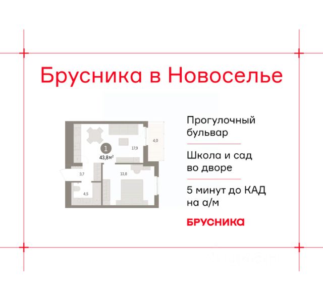 Успейте забронировать, пока действует скидка, срок предложения ограничен! Стоимость квартиры указана со скидкой, ваша экономия составит 1,140,000 руб. Звоните, наши менеджеры вам все расскажут. Однокомнатная квартира от застройщика с предчистовой отделкой в ЖК "Брусника в Новоселье" на 5 этаже. Общая площадь: 43.83 кв.м., жилая: 13.8 кв.м., площадь просторной кухни-столовой: 17.9 кв.м. Все окна выходят на одну сторону. В квартире один балкон, один совмещенный санузел. Высота потолков 2.7 м. Дом монолитный, многоподъездный, переменной этажности, от 8 до 9 этажей. Квартира находится в 10-й секции высотой 9 этажей в корпусе 2. На этаже 8 квартир. В подъезде 1 грузовой лифт. Окончание строительства - 4 квартал 2027 года. Оформление сделки по договору долевого участия. Новоселье — это городской поселок в Ломоносовском районе Ленинградской области. Он расположен в 5 км к югу от Финского залива, на самой границе региона. Вдоль поселка проходит Кольцевая автомобильная дорога, а сразу за ней начинается Санкт-Петербург — Красносельский район и Стрельна. Район зелёный и тихий, с разных сторон его окружают Шунгеровский заказник, Гореловский лес и дачные поселки. Есть вся необходимая инфраструктура: уже построенные детские сады, школы, клиники, торговые центры, ледовая арена. Так Новоселье сочетает в себе все преимущества городского комфорта и размеренной жизни рядом с природой. До выезда на КАД 5 минут, до ст. м. Ленинский проспект - 25 минут на а/м, до аэропорта Пулково - 30 минут на а/м. Брусника построит в Новоселье семь домов, в том числе башни и дома с разноуровневыми секциями. Высота зданий — от 8 до 12 этажей. Проект разделен на три очереди, на первом этапе мы возведём три дома в западной части квартала. В основе архитектурной концепции "Брусники в Новоселье" лежит лаконичность силуэтов и внимание к деталям. Мы разработали три фасадные темы, в основе которых лежит один прием — вертикальные и горизонтальные членения, реализованные за счет остекления балконов и лоджий, переменной этажности и цветового дробления фасадов. Выразительность последних достигается за счёт симметрии и использования декоративных элементов — карнизов и рамок вокруг окон. Входные группы мы заглубим относительно основной линии фасада, чтобы подчеркнуть входы в ритейл и места общего пользования. Материалы отделки будут приближены к натуральным. Первые этажи домов мы облицуем плиткой, имитирующей клинкерный кирпич. Кроме того, в проекте много террас, и все они разные: на первых этажах, на последних, угловые, с прямым фронтоном. Они расширяют пространство квартир и связывают их с природным контекстом. #26Evt5