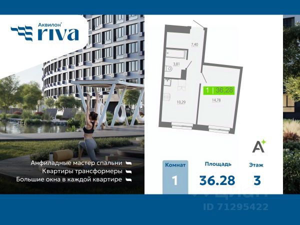 Продается 1-комн. квартира с отделкой в ЖК "Аквилон RIVA" на 3 этаже. Общая площадь: 36.28 кв.м., площадь просторной кухни-столовой: 10.29 кв.м. Высота потолков 2.73 м. Дом монолитный, трехподъездный, переменной этажности, от 16 до 20 этажей. Квартира находится в 1-й секции высотой 20 этажей в корпусе 1. На этаже 15 квартир. В подъезде 2 пассажирских и 1 грузовой лифт. Окончание строительства - 4 квартал 2027 года. Оформление сделки по договору долевого участия. В шаговой доступности от дома находится станция метро (расстояние по прямой) "Девяткино" (1.9 км). ЖК "Аквилон RIVA" - жилой комплекс комфорт класса у метро Девяткино от Группы Аквилон В самом сердце двора раскинулся собственный водоём — не просто украшение, а часть вашей повседневной жизни. Летом — это благоустроенная набережная для прогулок, отдыха в тени деревьев и тихих вечеров у воды. А зимой водоём превращается в залитый каток — место, где звучит смех, скользят коньки и рождаются семейные традиции. Здесь каждое время года раскрывает свой характер. Зона уединения: Места для занятия йогой и медитаций Мульти скворечники Качели с подсветкой для уютных бесед Высокие скамейки на набережной для отдыха и чтения на свежем воздухе Активная зона: Развивающие детские площадки для разных возрастов Спортивные площадки с зоной Ворк-аут, Столы для настольного тенниса Площадка для пляжного волейбола Преимущества Увеличенные окна с заполнением аргоном Корзины под кондиционеры Сити-боксы вместо балконов Безбарьерная среда Бесшумные скоростные лифты Контроль доступа на территорию и видеонаблюдение Отделка квартир Чистовая отделка в трех цветовых решениях: Sand, Terra и Graphite Дозаказ для любой квартиры Стандарты Группы Аквилон для вашей комфортной жизни Thermo-S экономия на коммунальных платежах за счет дополнительно утепленных стен, кровли и цоколя. Энергоэффективные окна с селективным покрытием и аргоновым заполнением Soundstop - дополнительная шумоизоляция внутренних перегородок и межэтажных перекрытий, шумозащитные окна, малошумные лифты Light-in - в квартирах устанавливаются широкоформатные окна, увеличены на 30%. Высота подоконников на уровне 60 см от пола. Vent-in - в каждой комнате есть клапаны индивидуальной вентиляции, которые обеспечивают приток свежего воздуха с улицы. inHOME умный дом в каждой квартире Интеллектуальная цифровая система, которая позволит дистанционно решать бытовые вопросы, управлять квартирой и экономить на оплате коммунальных услуг. В состав inHOME входят: IP-домофон, Face key, "умные" счетчики, датчики протечки, дистанционное отключение розеток, и т.д. Паркинг Отдельно стоящий 3-х уровневый паркинг Электрозарядки на территории ЖК Локация м. Девяткино 5 минут Центр города - 20 минут КАД 5 минут. #z64UA9