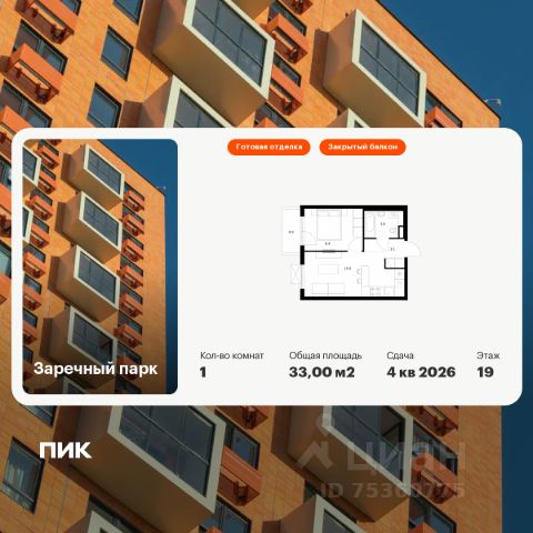 Продаётся 1-комн. квартира площадью 34,8 кв.м на 15 этаже 24 этажного дома (Корпус 6, Секция 1) проекта ПИК Заречный парк. Светлый просторный подъезд на уровне земли, функциональная планировка, большие окна, c отделкой. Жилой квартал "Заречный парк" расположен в районе Новое Девяткино Ленинградской области. В 7 минутах на автомобиле - станция метро "Девяткино", до КАД - 10 минут на машине. В 2026 году будет достроена шестиполосная трасса в обход Мурино, примыкающая к Пискарёвскому проспекту. Она станет дополнительным выездом на КАД для жителей "Заречного парка". Проект включает восемь домов высотой от 15 до 24 этажей, три многоуровневых паркинга, детский сад и школу. В зелёных дворах-парках будут оборудованы современные детские и спортивные площадки, обустроены места для отдыха. На первых этажах разместятся магазины, кафе и другие сервисы. Планировки продуманы так, чтобы каждый квадратный метр жилой площади можно было эффективно использовать. Все квартиры сдаются с готовой отделкой. Артикул 972994 (Застройщик ООО "СПЕЦИАЛИЗИРОВАННЫЙ ЗАСТРОЙЩИК ИНВЕСТАЛЬЯНС") [cn_sbp_1744039]