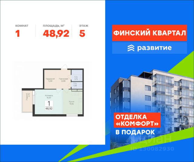 Продается квартира площадью 48.92 кв. м с отделкой. Квартира расположена на 5 этаже 7 этажного дома, в жилом комплексе комфорт-класса "Финский Квартал". "Финский квартал" - это уникальный проект комфорт-класса для тех, кто хотел бы жить на природе, но при этом находиться вблизи Северной столицы. Расположенный в окружении одного из самых крупных парков Ленобласти - Лахтинского, проект предлагает своим жителям доступную инфраструктуру, комплексное благоустройство территории, 6 секций переменной этажности с современной архитектурой, которая гармонично дополнит район и будет радовать проживающих еще много лет. Найдите свою идеальную квартиру в ЖК "Финский Квартал"! Расположение Пешком: - 5 мин. до детского сада и супермаркета; - 8 мин. до остановки "Зеленая улица"; - 10 мин. до лесопарковой зоны. На автомобиле: - 3 мин. до Приозерского шоссе; - 10 мин. до Выборгского шоссе; - 12 мин. до КАД; - 30 мин. до ст. метро "Проспект Просвещения". Благоустройство - большой яркий двор с ландшафтным дизайном; - живая изгородь, кустарники и хвойники; - умное зонирование тихих и активных площадок; - сквер для прогулок и отдыха; - изумрудные лужайки для пикников; - дорожки для пешеходов и велосипедистов; - большие игровые площадки; - мягкое покрытие для безопасности детей; - тренажеры, турники и веревочные комплексы; - пространство только для пешеходов - без машин; - наземная парковка за пределами двора; - специальные площадки для выгула питомцев; - светлые дизайнерские холлы; - светопрозрачное остекление и большие окна; - декоративная подсветка парадных; - колясочные помещения для комфорта родителей; - места для хранения велосипедов и самокатов. Окружение - свежий воздух: парк усадьбы "Осиновая Роща", Лахтинский парк, лесопарк "Курортный", Левашовский заказник, Ново-Кавголовский лесопарк; - водные объекты: Сестрорецкий Разлив, пляжи у Тохколодского и Большого озер, залив Сярюнлахти; - инфраструктура: 2 детских сада, школа, кафе, продуктовый супермаркет, больница; - для крупных покупок: ТРЦ "Китай-Город", "Мега-Парнас"", "Гранд Каньон"; - активный отдых: горнолыжные комплексы "Охта-Парк" и "Токсово", конный клуб "Осиновая Роща", ФОК "Норус".