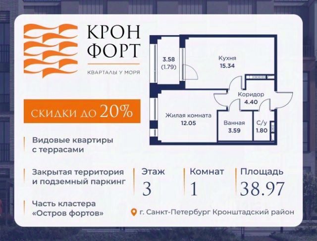 Стоимость квартиры указана со скидкой 20%. Скидка предоставляется при 100% оплате или несубсидированной ипотеке. Предлагается квартира площадью 52.3 кв.м в жилом комплексе "Кронфорт. Центральный" в Санкт-Петербурге (Кронштадт). Возможна покупка с использованием льготных и специальных ипотечных программ с государственной поддержкой. Высота потолков в квартирах — от 3 до 3,4 метров, окна увеличенного размера, есть варианты с эркерами, французскими балконами, лоджиями и террасами. Жилой квартал состоит из пяти четырехэтажных корпусов с закрытыми охраняемыми дворами, свободными от машин. Первые этажи формируют торговые променады в стиле пешеходных улиц исторической части Петербурга и Кронштадта. Внутренние пространства между корпусами — пешеходные зоны с уютными площадями. Архитектурный облик квартала разработан бюро "Проектная культура" и международной компанией Chapman Taylor. Инфраструктура комплекса включает: - Лицей с двумя бассейнами - Детский сад на 150 мест с бассейном и закрытой территорией - Веревочный парк - Игровые площадки для активного отдыха; - Кабинет врача общей практики. - Подземные паркинги с лифтами. - Мусоросборные камеры, индивидуальные кладовые. - Закрытые дворы с контролем доступа и видеонаблюдением. - Мультформатный стрит-ретейл с кафе и ресторанами. - Триатлон-центр и беговые/велодорожки. - Учебно-тренировочный комплекс для детей "Лагерь настоящих героев". Транспортная доступность обеспечивает удобный выезд на КАД (около 1-3 км), 2 минуты пешком до автобусной остановки "Лицей", 25 минут до Сестрорецка, 30 минут до "Лахта-центра", 50 минут до аэропорта "Пулково" и 60 минут до Московского вокзала. Для любителей моря доступен маршрут на "Метеоре" до центра Санкт-Петербурга. Отделка квартир предлагается как с готовой чистовой отделкой, так и со свободной планировкой без отделки для реализации индивидуальных дизайнерских решений. В третьем корпусе, продажи которого стартовали в марте 2025 года, доступны квартиры с просторными террасами, тремя балконами, кухнями-гостиными до 38 кв.м с окнами на две стороны, обеспечивающими панорамное освещение и виды. Если вам нужна помощь с оформлением ипотеки или дополнительная информация по комплексу и условиям покупки, обращайтесь в отдел продаж за консультацией.