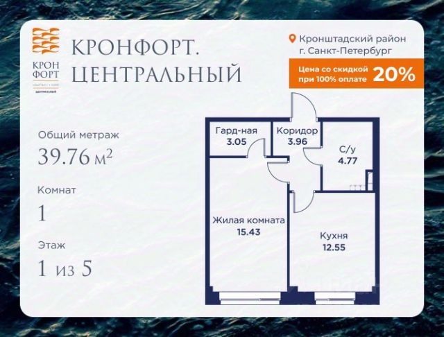 Стоимость квартиры указана со скидкой 20%. Скидка предоставляется при 100% оплате или несубсидированной ипотеке. Предлагается квартира площадью 37.96 кв.м в жилом комплексе "Кронфорт. Центральный" в Санкт-Петербурге (Кронштадт). Возможна покупка с использованием льготных и специальных ипотечных программ с государственной поддержкой. Высота потолков в квартирах — от 3 до 3,4 метров, окна увеличенного размера, есть варианты с эркерами, французскими балконами, лоджиями и террасами. Жилой квартал состоит из пяти четырехэтажных корпусов с закрытыми охраняемыми дворами, свободными от машин. Первые этажи формируют торговые променады в стиле пешеходных улиц исторической части Петербурга и Кронштадта. Внутренние пространства между корпусами — пешеходные зоны с уютными площадями. Архитектурный облик квартала разработан бюро "Проектная культура" и международной компанией Chapman Taylor. Инфраструктура комплекса включает: - Лицей с двумя бассейнами - Детский сад на 150 мест с бассейном и закрытой территорией - Веревочный парк - Игровые площадки для активного отдыха; - Кабинет врача общей практики. - Подземные паркинги с лифтами. - Мусоросборные камеры, индивидуальные кладовые. - Закрытые дворы с контролем доступа и видеонаблюдением. - Мультформатный стрит-ретейл с кафе и ресторанами. - Триатлон-центр и беговые/велодорожки. - Учебно-тренировочный комплекс для детей "Лагерь настоящих героев". Транспортная доступность обеспечивает удобный выезд на КАД (около 1-3 км), 2 минуты пешком до автобусной остановки "Лицей", 25 минут до Сестрорецка, 30 минут до "Лахта-центра", 50 минут до аэропорта "Пулково" и 60 минут до Московского вокзала. Для любителей моря доступен маршрут на "Метеоре" до центра Санкт-Петербурга. Отделка квартир предлагается как с готовой чистовой отделкой, так и со свободной планировкой без отделки для реализации индивидуальных дизайнерских решений. В третьем корпусе, продажи которого стартовали в марте 2025 года, доступны квартиры с просторными террасами, тремя балконами, кухнями-гостиными до 38 кв.м с окнами на две стороны, обеспечивающими панорамное освещение и виды. Если вам нужна помощь с оформлением ипотеки или дополнительная информация по комплексу и условиям покупки, обращайтесь в отдел продаж за консультацией.