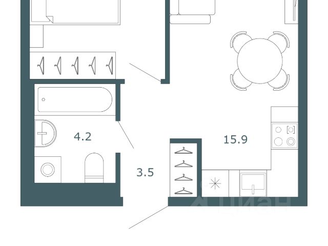 Помещается полноценная кровать, рабочая зона и дополнительное хранение.