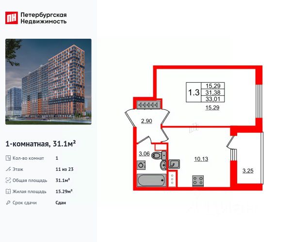 Продается уютная 1-комнатная квартира от застройщика в жилом комплексе "Город звезд" в новом городе на правом берегу Невы. До метро можно добраться на транспорте всего за 13 минут. Удобная, классическая планировка, кухня 10.13 м², вместительная прихожая 2.9 м². Общая площадь квартиры - 31.1 м², жилая 15.29 м², высота потолка 2.77 м. Квартира продается с отделкой "Норд Лайн светлый". Что особенного в ЖК "Город звезд"? • Инновационный Лицей Setl с оригинальной архитектурной концепцией и уникальной образовательной средой • Невский лесопарк под окнами - всегда свежий воздух и полноценный отдых на природе • Четыре тематические площади отдыха с разнообразным благоустройством • Аллея Звёзд - променад протяженностью 5 км с ландшафтным озеленением, зонами отдыха и велодорожкой • Выход на набережную реки Утки, где можно порыбачить или взять напрокат лодку • Единая входная группа с ресепшен и подземный паркинг
