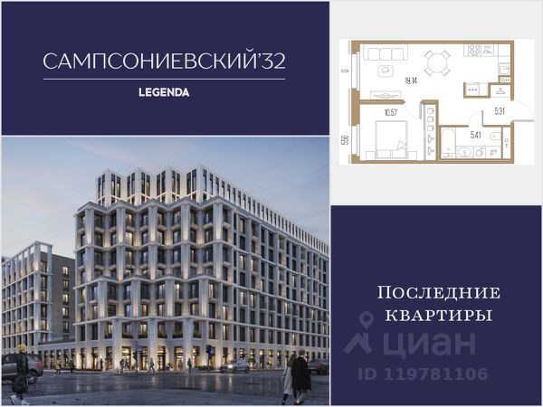Квартира с одной спальней в комплексе "Сампсониевский 32" от LEGENDA на 7 этаже. -Общая площадь: 42.46 кв.м. -Жилая: 13.18 кв.м. -Площадь просторной кухни-столовой: 17.91 кв.м. -Высота потолков 2.7 м. Все окна выходят на одну сторону. В квартире один совмещенный санузел. ЖК "Сампсониевский, 32" квартал бизнес-класса в Выборгском районе Санкт-Петербурга недалеко от набережной Большой Невки и Петроградской стороны. Отличают комплекс каскадные фасады с большой площадью остекления, видовые квартиры с террасами. Современные инженерные и технические решения, повышающие качество жизни TechnoBox включают в себя: стационарный и удаленный контроль дома, систему Air Design, обеспечивающую чистый воздух без лишнего шума, мультисервисную сеть, объединяющую коммуникационные системы. Квартиры сдаются с предчистовой отделкой: выровнены пол и стены, проведена электрика, предусмотрена шумоизоляция, встроенная система вентиляции. В каждой квартире установлена взломостойкая входная дверь, окна со специальным термоизолированным алюминиевым профилем. В ЖК "Сампсониевский, 32" много вариантов планировок: квартиры с террасой, мастер-спальней, ванной комнатой с окном, гардеробной комнатой. Двор закрыт от транспорта, здесь будут зоны с дизайнерским оформлением для игр и отдыха. Срок сдачи 4 квартал 2026 года. В отапливаемом подземном паркинге 298 мест, спуститься туда можно на лифте из своей квартиры. Комплекс находится на границе крупных районов, рядом с набережными, которые ведут в Приморский, Калининский и Центральный районы, а через Сампсониевский, Гренадёрский и Кантемировский мосты можно попасть в Петроградский район. До станции метро "Выборгская" 900 м, до станции метро "Петроградская" 2,6 км. Финляндский вокзал находится в 2,5 км от ЖК, а Западный скоростной диаметр (ЗСД) в 10 км. Рядом с ЖК находится несколько гимназий, общеобразовательных школ и детских садов. Здесь много медицинских учреждений, кафе, ресторанов, торговых центров, гипермаркетов. Меньше чем в 1 км от ЖК Сампсониевский и Выборгский сады, а в 2 км находится Ботанический сад, набережная реки Карповки с качелями и зонами отдыха у воды.