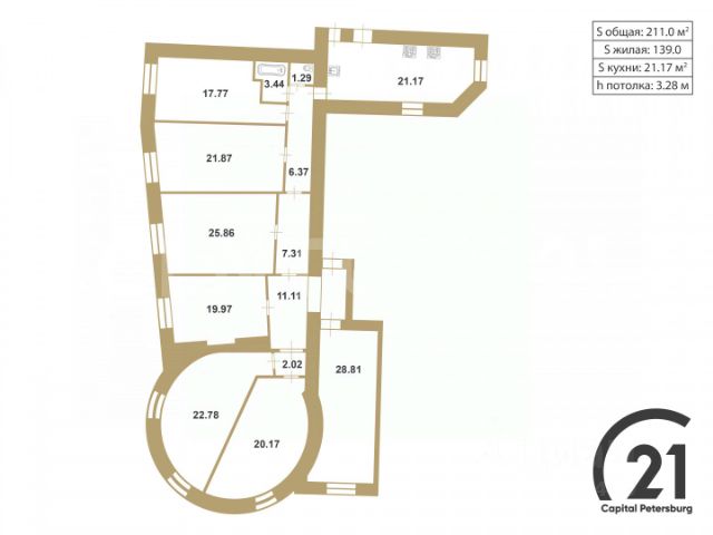 6 просторных комнат площадью 28.81; 20.17; 22,78; 19,97; 25,86; 21,87 и 17,77 -подсобное помещение. Кухня-21,77кв.м.