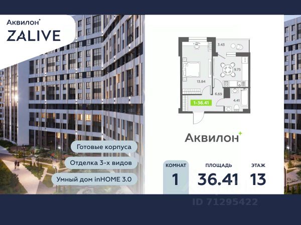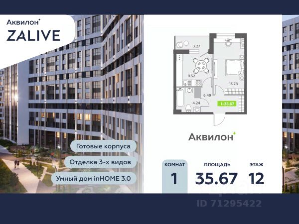 Купи квартиру в ЖК "Аквилон ZALIVE"! Отделка В квартире выполнена предчистовая отделка WhiteBox +Возможен дозаказ отделки в любом из 3 цветов: SAND, TERRA, GRAPHITE Отделка входит в стоимость квартиры в ДДУ ЖК "Аквилон ZALIVE" Жилой комплекс "Аквилон ZALIVE" расположился в уникальной части престижного Васильевского острова. С одной стороны рядом деловой и исторический центр, с другой берег Финского залива и новая современная инфраструктура в пешей доступности. Проект включает в себя пять тринадцатиэтажных "умных" домов в едином архитектурном стиле. Насыщенная социальная инфраструктура, инновации в каждой квартире, стильное благоустройство территории и видовые характеристики это лишь часть уникальных преимуществ жилого комплекса "Аквилон ZALIVE". -Малошумные лифты -Сквозные парадные -Светопрозрачные входные группы -Школа во дворе -Безбарьерная среда -Паркинг Стандарты Группы Аквилон для вашей комфортной жизни Thermo-S экономия на коммунальных платежах за счет дополнительно утепленных стен, кровли и цоколя. Энергоэффективные окна с селективным покрытием и аргоновым заполнением Soundstop - дополнительная шумоизоляция внутренних перегородок и межэтажных перекрытий, шумозащитные окна, малошумные лифты Light-in - в квартирах устанавливаются широкоформатные окна, увеличены на 30%. Высота подоконников на уровне 60 см от пола. Vent-in - в каждой комнате есть клапаны индивидуальной вентиляции, которые обеспечивают приток свежего воздуха с улицы. inHOME умный дом в каждой квартире Интеллектуальная цифровая система, которая позволит дистанционно решать бытовые вопросы, управлять квартирой и экономить на оплате коммунальных услуг. В состав inHOME входят: IP-домофон, Face key, "умные" счетчики, датчики протечки, дистанционное отключение розеток, и т.д. Двор ваш личный парк Для разработки проекта благоустройства и озеленения Группа Аквилон привлекла студию DEREVO PARK, которую ассоциация ландшафтных архитекторов России четыре года подряд признавала лучшей. Два хвойных сада, расположенные вдоль западной стороны квартала, станут визитной карточкой ЖК "Аквилон ZALIVE". Локация и инфраструктура Васильевский остров это море и прогулки, Санкт-Петербургский Государственный Университет и Ростральные колонны, музей современного искусства "Эрарта" и концептуальное пространство "Севкабель Порт". Достаточно переехать через мост и вот вы уже в центре или на Петроградской стороне. - 7 мин. до развязки ЗСД -12 мин. до м. Приморская -15 мин. до м. Невский проспект #2scfCT 1-комнатной квартиры с евроремонтом на бульваре Головнина в Санкт-Петербурге.