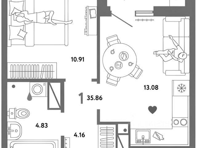 - евро-планировка с кухней-гостиной 20,1 м2 и двумя спальнями 12,3 и 13,8 м