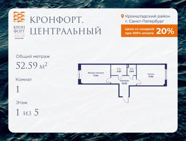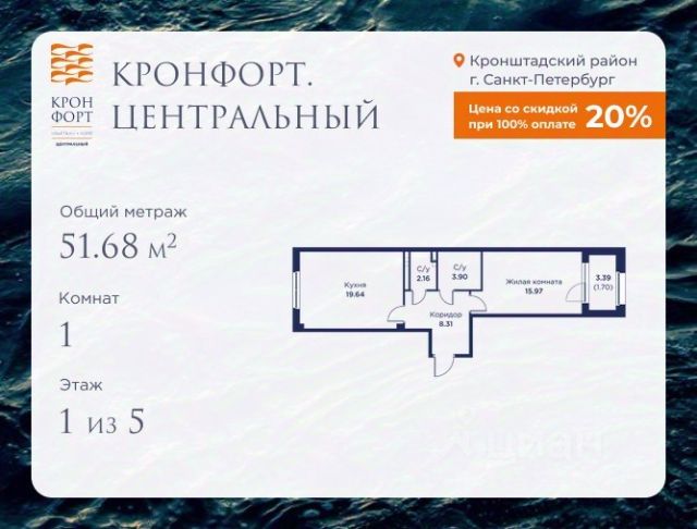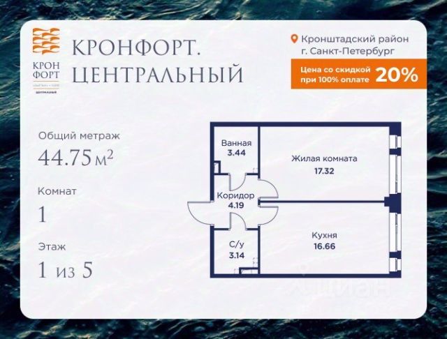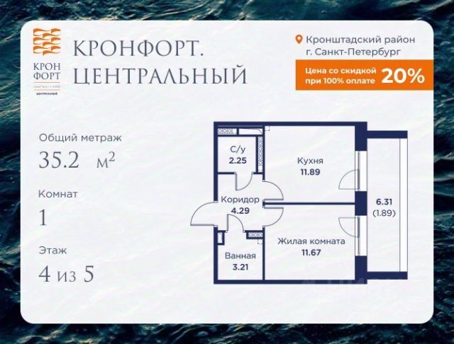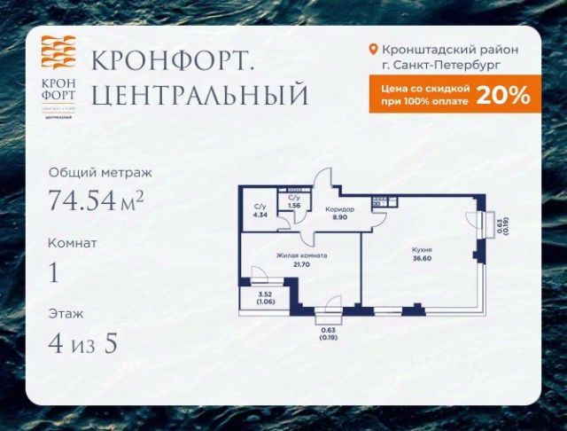 Стоимость квартиры указана со скидкой 20%. Скидка предоставляется при 100% оплате или несубсидированной ипотеке. Предлагается квартира площадью 36.11 кв.м в жилом комплексе "Кронфорт. Центральный" в Санкт-Петербурге (Кронштадт). Возможна покупка с использованием льготных и специальных ипотечных программ с государственной поддержкой. Высота потолков в квартирах — от 3 до 3,4 метров, окна увеличенного размера, есть варианты с эркерами, французскими балконами, лоджиями и террасами. Жилой квартал состоит из пяти четырехэтажных корпусов с закрытыми охраняемыми дворами, свободными от машин. Первые этажи формируют торговые променады в стиле пешеходных улиц исторической части Петербурга и Кронштадта. Внутренние пространства между корпусами — пешеходные зоны с уютными площадями. Архитектурный облик квартала разработан бюро "Проектная культура" и международной компанией Chapman Taylor. Инфраструктура комплекса включает: - Лицей с двумя бассейнами - Детский сад на 150 мест с бассейном и закрытой территорией - Веревочный парк - Игровые площадки для активного отдыха; - Кабинет врача общей практики. - Подземные паркинги с лифтами. - Мусоросборные камеры, индивидуальные кладовые. - Закрытые дворы с контролем доступа и видеонаблюдением. - Мультформатный стрит-ретейл с кафе и ресторанами. - Триатлон-центр и беговые/велодорожки. - Учебно-тренировочный комплекс для детей "Лагерь настоящих героев". Транспортная доступность обеспечивает удобный выезд на КАД (около 1-3 км), 2 минуты пешком до автобусной остановки "Лицей", 25 минут до Сестрорецка, 30 минут до "Лахта-центра", 50 минут до аэропорта "Пулково" и 60 минут до Московского вокзала. Для любителей моря доступен маршрут на "Метеоре" до центра Санкт-Петербурга. Отделка квартир предлагается как с готовой чистовой отделкой, так и со свободной планировкой без отделки для реализации индивидуальных дизайнерских решений. В третьем корпусе, продажи которого стартовали в марте 2025 года, доступны квартиры с просторными террасами, тремя балконами, кухнями-гостиными до 38 кв.м с окнами на две стороны, обеспечивающими панорамное освещение и виды. Если вам нужна помощь с оформлением ипотеки или дополнительная информация по комплексу и условиям покупки, обращайтесь в отдел продаж за консультацией. Продается 1-комнатная квартира с евроремонтом в районе Кронштадтский в Санкт-Петербурге.