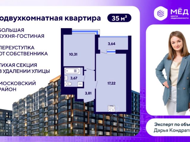 Продается просторная 1-комнатная квартира от застройщика в жилом комплексе "Титул в Московском" в престижном Московском районе. До метро можно добраться пешком всего за 25 минут. Удобная, классическая, функциональная европланировка, большая кухня-гостиная 15.49 м², просторная прихожая 5.55 м². Общая площадь квартиры - 36.04 м², жилая 10.14 м², высота потолка 2.77 м. Квартира продается с отделкой "Норд Лайн серый плюс". Что особенного в ЖК "Титул в Московском"? • Престижный Московский район • Авторская архитектурная концепция • 2 центральные входные группы с ресепшн и лаундж-зонами • Кленовая аллея с арт-стеллой, цветочная аллея и сад трав • Уютные дворы-патио, площадки SetlKids и SetlSport • Инновационный Лицей Setl с оригинальной архитектурной концепцией и уникальной образовательной средой 1-комнатной квартиры с евроремонтом на улице Кубинская в Санкт-Петербурге.