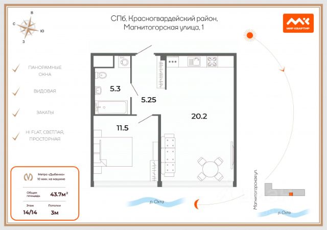 Дорогие покупатели, вас ждет уютная квартира в одном из лучших домов на Малой Охте - жилом комплексе бизнес-класса "Magnifica Residence". Коротко о главном: гармоничная благородная дизайн-концепция, новейший ремонт, продуманная планировка, огромные окна, отопление без батарей. Остановимся подробнее на том, почему ваша жизнь в этой квартире будет прекрасна: жилой комплекс шведского застройщика Bonava украсил ажурный берег Малой Охты, а также предоставляет своим жителям более высокий уровень комфорта. Безупречный жилой комплекс с рациональной и эмоциональной точек зрения, энергоэффективный дом по стандарту GREEN ZOOM комфортный 4 этаж, общая площадь квартиры 43,6 метров, Планировка безупречная; кухня-гостиная 24,3 м . укомплектованная мебелью и техникой, уютная спальня . Напротив просторный санузел. Благодаря Увеличенным оконным проемам , много света ! Французский балкон с кухни-гостиной создает атмосферу уюта и гармонии. В подарок новым собственникам остается вся мебель! заезжай и живи! Закрытая территория, подземный паркинг, Видеонаблюдение, территория , с по-европейски качественной ландшафтной концепцией, во дворе так же уютно и спокойно; зелень, кусты, деревья, скамейки, дорожки, гармония и умиротворение выход на милейшая набережную - место для прогулок и раздумий с ивами, березами и активными площадками. Развитая инфраструктура: Школы, садики, поликлиники, магазины, в 10 минутах ТРЦ Охта Молл - один из самых спокойных комплексов в городе. 15 минут пешком до станции метро Новочеркасская , а так же много транспорта и 20 минут на транспорте по Невского проспекта. !! Один взрослый собственник, юридически чистая квартира, без обременений, прямая продажа! Буду рада ответить на ваши вопросы и организовать показ, звоните! Продам 1-комнатную квартиру с евроремонтом на улице Магнитогорская в Санкт-Петербурге.