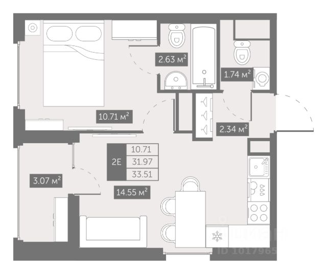 В квартире большая комната, которая позволит реализовать любые идеи по дизайну и планировке. Особый плюс квартиры — просторная кухня. Ее можно разделить на две зоны: кухня-гостиная или кухня-кабинет. Маленький коридор не съедает лишние квадратные метры. У балкона есть большой потенциал — можно установить окна в пол и сделать его уютным местом для отдыха или работы с панорамным видом на парк.